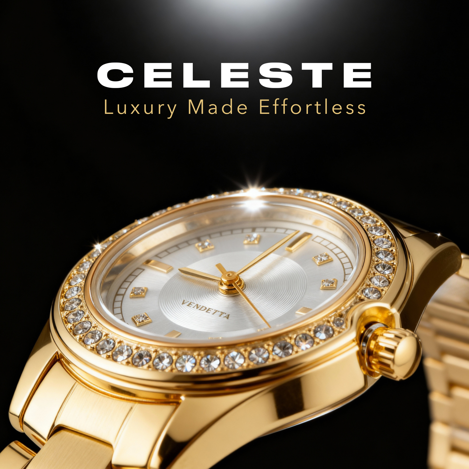 The Celeste Watch embodies timeless beauty with a modern edge. Crafted in radiant gold with crystal-set detailing, it delivers a statement of effortless sophistication. Designed for those who move with confidence, Celeste is more than a timepiece—it’s your signature of refined luxury, made to shine from day to night.